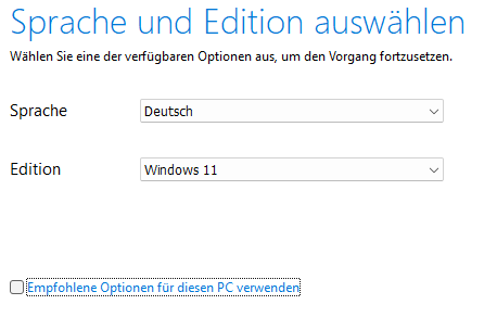 Danach kann die Sprache und das System ausgewählt werden. Oder die „Empfohlenen Optionen“, welche die Einstellungen des aktuellen Systems widerspiegeln.