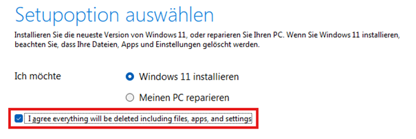 Danach werden die Setup Optionen ausgewählt hier muss bestätigt werden, dass alle Daten gelöscht werden sollen.